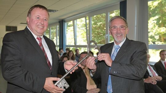 Landrat Jürgen Pföhler (links) nahm aus den Händen des Ersten Beigeordneten der Verbandsgemeinde Adenau, Jürgen de Temple, den Schlüssel entgegen, der die Trägerschaft für die Fachoberschule in Adenau symbolisiert.
