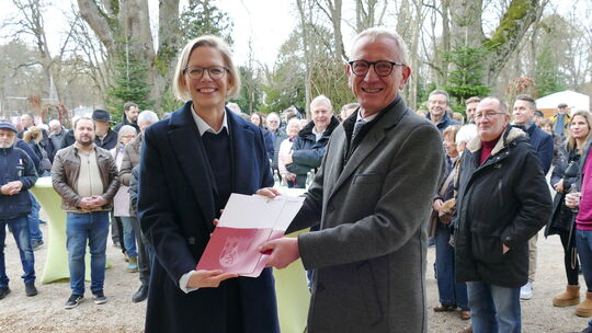 Bewilligungsbescheide für Wiederaufbaumittel aus dem Aufbaufonds von Land und Bund hatte Staatssekretärin Simone Schneider mitgebracht und an Bürgermeister Guido Orthen übergeben. Jochen Tarrach