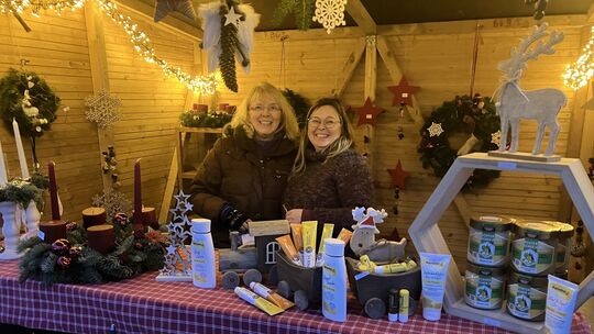 Gabi Schneider (links) und Tanja Falckenberg (rechts) boten Basteleien aus Holz, regionalen Honig und echte Bienenwachskerzen an. Martin Ingenhoven