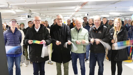 Mit dem traditionellen Durchtrennen des Absperrbands wurde die Marktgarage wieder geöffnet. Den Schnitt mit der goldenen Schere tätigten (von links) Bürgermeister Guido Orthen, der Erste Beigeordnete Peter Diewald, Ortsvorsteher Ferdi Heuwagen, Herbert Wiemer von der AuEG und einer Vertreterin der Baufirma. Jochen Tarrach