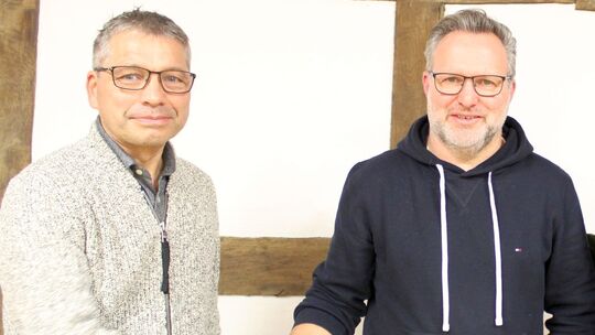 Guido Schmitz (rechts) übergibt die Amtsgeschäfte an den Ersten Beigeordneten Andreas Bläser. Frank Bugge