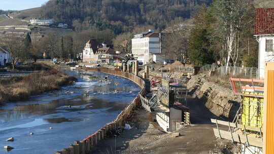 Die Carl-von-Ehrenwall-Allee ist eine der wichtigsten Verkehrsachsen in Ahrweiler. Nach der Flut 2021 wird sie neu gebaut – dort entsteht zum Hochwasserschutz eine große Prallwand. Die Bauarbeiten für diese sind derzeit in vollem Gange.