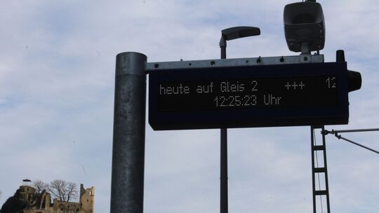 Moderne Hinweise vor geschichtsträchtiger Kulisse: die Anzeige im Bahnhof von Altenahr mit der Burg Are im Hintergrund. Frank Bugge