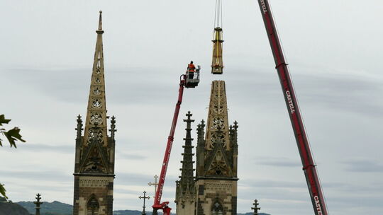 Die Turmspitzen der Remagener St. Apollinariskirche sind ein weithin sichtbares Alleinstellungsmerkmal der Römerstadt und beliebtes Fotomotiv. Doch jetzt wurde einer der gusseisernen Turmhelme mit Unterstützung eines 60 Meter hohen Krans abgenommen, um festzustellen, wie hoch der Sanierungsaufwand der Türme insgesamt ist.