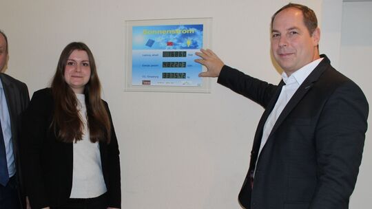 Fachbereichsleiter Rainer Dommermuth (rechts) zeigt Klimaschutzmanagerin Adrienne Gäb und Bürgermeister Johannes Bell an einer Infotafel im Foyer des Rathauses die Energiemenge, die auf dem Dach des Verwaltungsgebäudes mit einer Fotovoltaikanlage erzeugt wird und wie hoch die CO2-Einsparung ist. Foto: Hans-Willi Kempenich Hans-Willi Kempenich