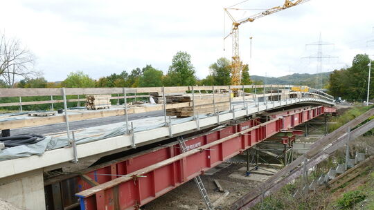 Erst wenn die roten Stützträger entfernt worden sind, kann die schwungvolle neue Überführung ganz gesehen werden. Jochen Tarrach