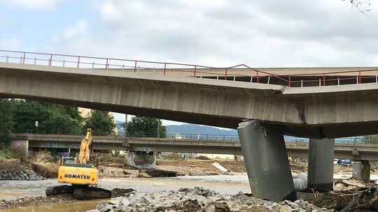 Darüber informiert der Landesbetrieb Mobilität (LBM) Cochem-Koblenz in einer Pressemitteilung. Am besagten Wochenende werden zwölf Stahlträger mit zwei großen Autokränen auf die vorbereiteten Auflager und Pfeiler der neuen Ahrbrücke eingehoben. Diese Träger, im Einzelnen etwa 35 Meter lang und circa 60 Tonnen schwer, bilden später die tragende Unterbaukonstruktion für die Fahrbahn.