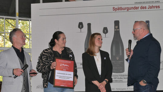 Bei der Präsentation des druckfrischen „Vinum Weinguide Deutschland 2026“ in Hattenheim (Rheingau) sind die Dernauer Winzertöchter Meike und Dörte Näkel für den besten Spätburgunder des Jahres ausgezeichnet worden: Ihr 2023er Walporzheimer Kräuterberg Spätburgunder VDP Großes Gewächs ist ein monumentaler Rotwein (99 Euro pro Flasche).