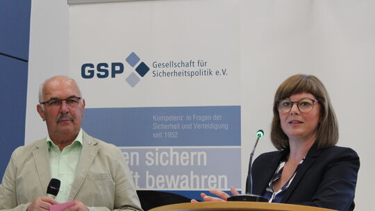 Sektionsleiter Josef Schmidhofer von der Gesellschaft für Sicherheitspolitik in Bad Neuenahr-Ahrweiler moderiert die Fragerunde mit Innenstaatssekretärin Nicole Steingaß über die Neuaufstellung des Katastrophenschutzes im Land. Frank Bugge