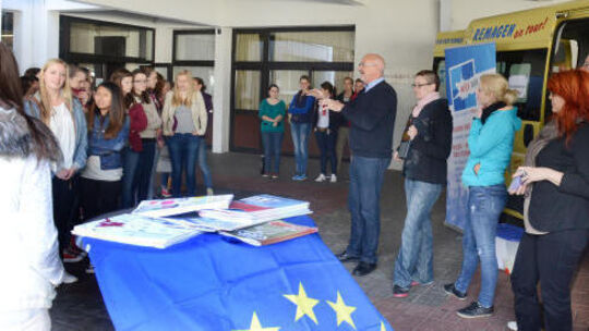 Jürgen Schwarzmann und Kollegen wollen mit dem Mobil der Stimmen Jugendliche über die Wahl informieren und sie animieren, ihr gesellschaftliches Umfeld mitzugestalten.