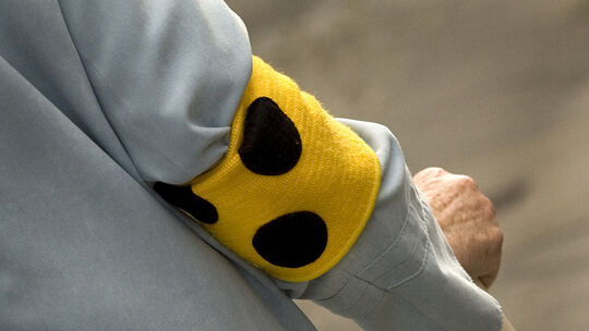 Eine Frau mit einer Armbinde, die auf ihre Sehbehinderung hinweist Arno Burgi. picture alliance / dpa