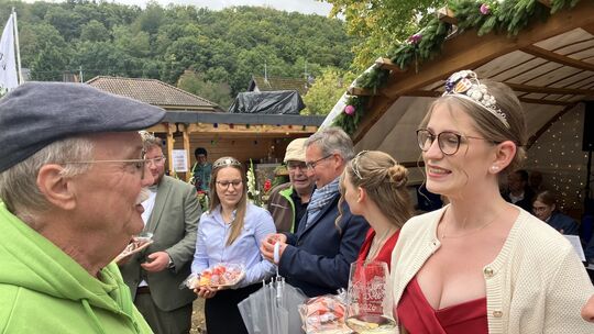 Amelie Doll, die Bachemer Weinkönigin, ließ es sich auch an ihrem Geburtstag nicht nehmen, die Besuchstradition fortzusetzen. Hubert Harzen gratulierte ihr im Namen der Veranstalter zu ihrem Ehrentag. Martin Ingenhoven