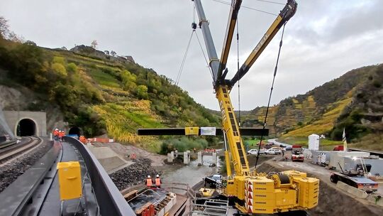 Ein großer Moment für den Wiederaufbau: Der Kran schwenkt das Brückenteil über die Ahr unterhalb der Saffenburg zu seinem Platz auf die Widerlager. Hinten die beiden Tunnelröhren für Bahn und Radweg. Frank Bugge