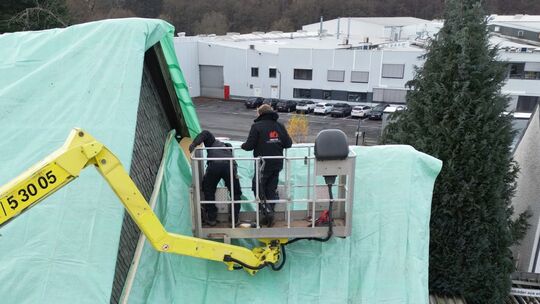 Ein Autokran ist nötig, um das schützende Zelt um das Fachwerkhaus in Scheuerfeld zu spannen. Ein Baukran hatte die Folie über das Gebäude gehoben, Zimmerleute befestigen sie. Robert Mehl
