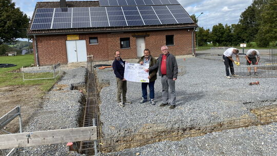 Ortsbürgermeister Helmut Rötzel (Bildmitte) mit den Beigeordneten Werner Oberheidt (links) und Frank Schumacher auf der Baustelle, wo das neue Bürgerhaus Breitscheidt entsteht. Rolf-Dieter Rötzel