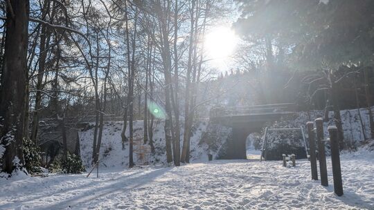 Eine dichte, weiße Schneedecke hüllt derzeit die Park-Anlage am Siegufer in Kirchen ein und lässt das Gelände am unteren Riegel in diesem Januar ein wenig verschlafen wirken. Momentan herrscht winterliche Ruhe auf dem Areal, das an der Sieg und an einer Fußgängerbrücke gelegen ist.