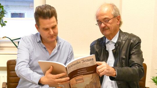 Stadtbürgermeister Benjamin Geldsetzer (links) freut sich über die detaillierte Darstellung, die Historiker Thomas Bartolosch seiner Heimatstadt Betzdorf gewidmet hat. Foto: Gaby Wertebach Gaby Wertebach