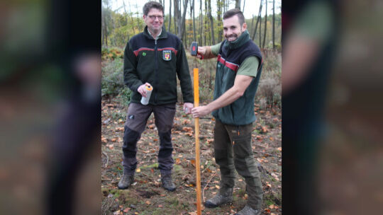 Forstalltag im Wald nahe Wölmersen: Jendrik Birk (rechts) markiert im Rahmen seiner Praxisausbildung, die zum Dualen Studium der Forstwirtschaft gehört, den Platz für eine Gruppenpflanzung. Markus Follmann, Leiter des Forstreviers Obererbach, unterstützt ihn in diesen Praxisphasen mit Rat und Tat. Julia Hilgeroth-Buchner