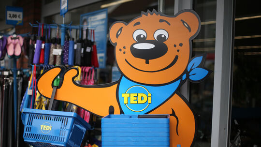 Eine Bärenfigur mit einem Logo der deutschen Handelskette Tedi. Entlässt der Nonfood-Discounter zahlreiche Mitarbeiter in Altenkirchen? Darüber spekuliert man derzeit auf Facebook. Ina Fassbender. picture alliance / Ina Fassbender/dpa