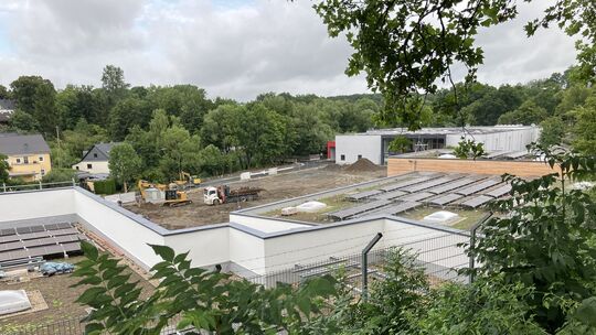 Blick von oben auf einen Teil des Fachmarktzentrums: Die Arbeiten sind in vollem Gang, am 23. Oktober 2025 soll das FMZ Altenkirchen eröffnet werden. Annika Stock