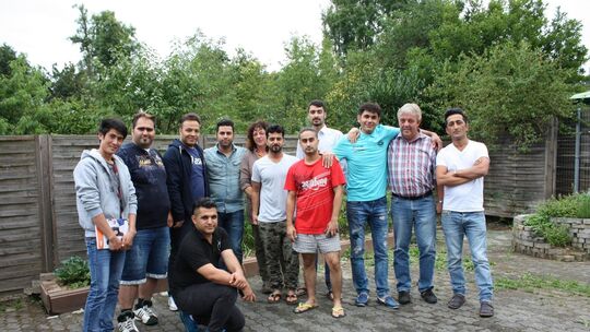 Ein Teil der Männer, die gemeinsam in Fluterschen leben. Rückenstärkung erhalten sie von Gabriele Lemke (6. von links) und Klaus Dege (2. von rechts) vom Vorstand des Vereins Flüchtlingshilfe Fluterschen. Foto: Beate Christ