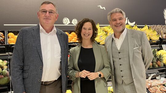 Stadtbürgermeister Ralf Lindenpütz, Maike Sanktjohanser (Geschäftsführerin Rewe-Petz) und Investor Bernard Dov Wideker (von links). Annika Stock