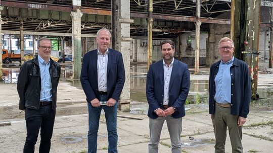 Investor Peter Merz (von rechts) zeigt beim Pressetermin dem Betzdorfer Stadtbürgermeister Johannes Behner, Wirtschaftsförderer Michael Becher und dem Ersten Beigeordnete Marc Schwan in Vertretung von Joachim Brenner, Bürgermeister der Verbandsgemeinde Betzdorf-Gebhardshain, den Fortschritt. Thomas Leurs