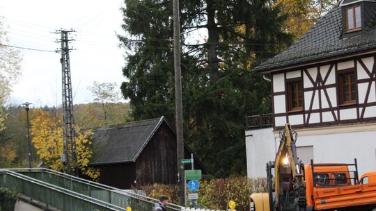 Genauer gesagt handelt es sich um Arbeiten im Bereich der Rampe. Damit diese in Zukunft barrierefrei ist, also zum Beispiel gut von Rollstuhlfahrern passiert werden kann, wird sie ein wenig in Richtung Gehweg verlängert. Um dies bewerkstelligen zu können, mussten vorab ein paar unterirdische Leitungen umgelegt werden.