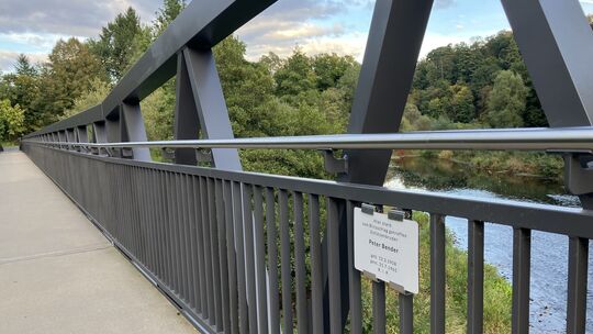 Der Oberbau der neuen Heubrücke zeichnet sich durch seine Aluminium-Fachwerkkonstruktion aus. Eine Plakette am Geländer erinnert an das Gewitterunglück im Sommer 1965. Elmar Hering