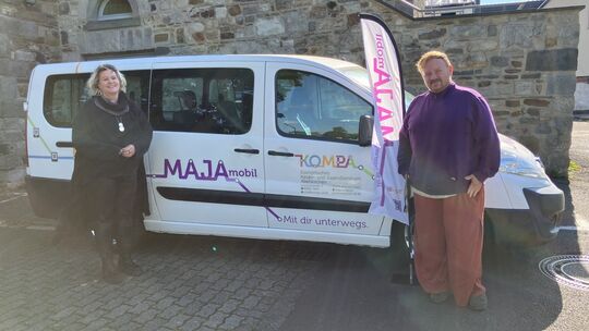 Elisabeth Born-Hild und Dominic Pritz stehen neben dem "Maja-Mobil" - hierbei handelt es sich um ein Angebot des Kompa Altenkirchen zur aufsuchenden Jugendarbeit in der Kreisstadt. Annika Stock
