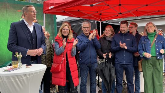 Alexander Schweitzer, stellvertretender SPD-Bundesvorsitzender und Ministerpräsident von Rheinland-Pfalz (links) machte im Rahmen seiner Tour „Vorbeikommen. Wein genießen. Austauschen.“ auch in Daaden Halt. Annika Stock