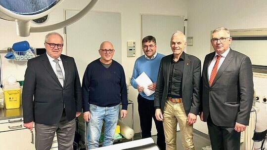 Machten sich vor Ort ein Bild von dem medizinischen Angebot des MVZ in Altenkirchen (von links): Landrat Peter Enders, der Arzt Frank Hostmann, Diakonie-Geschäftsführer Josef Rosenbauer, Fred Jüngerich, Bürgermeister der Verbandsgemeinde Altenkirchen-Flammersfeld, und Stadtbürgermeister Ralf Lindenpütz. Thorsten Stahl. Kreisverwaltung Altenkirchen