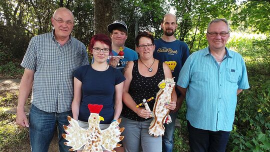Melanie Strauch (3. von rechts) ist die neue Schützenkönigin bei der St. Sebastianus Schützenbruderschaft Gebhardshain. Zu den ersten Gratulanten zählten Brudermeister Günter Pauli (von links), Michelle Seibert, die Jungschützenkönigin wurde, Marius Weber, der sich den Reichsapfel holte, Steffen Pauli, der sich die Krone sicherte, und Kassierer Carlos Unkel. Foto: Regina Müller mue