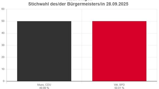 Der 28-Jährige Tristan Vitt (SPD) ist damit neuer Bürgermeister. Er gewann mit nur sieben Stimmen Vorsprung oder 50,01 Prozent (14.687 Stimmen) vor dem bisherigen Amtsinhaber Steffen Mues (CDU), der auf 49,99 Prozent (14.680 Stimmen) kam. Der 60-jährige Mues führte zuvor 18 Jahre lang die Geschicke der Krönchenstadt. Nach dem ersten Wahlgang hatte er noch gut 13 Prozentpunkte vor seinem Konkurrenten gelegen. Mit Vitt übernimmt erstmals seit Einführung der Bürgermeister-Direktwahlen in Nordhein-Westfalen 1999 ein Sozialdemokrat die Amtsgeschäfte.