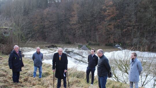 Am Siegwehr bei Euteneuen fließt tagtäglich viel Wasserkraft ungenutzt an einer funktionstüchtigen Turbine vorbei. Dagegen wehren sich trotz gegenläufiger Gerichtsurteile (von links) MdL Michael Wäschenbach, der Mudersbacher Beigeordnete Ulrich Merzhäuser, Investor Richard Kail und Sohn Kilian, Gerd Schreiner als Vorsitzender des Mainzer Ausschusses für Klima, Energie und Mobilität sowie MdL Matthias Reuber. Peter Seel