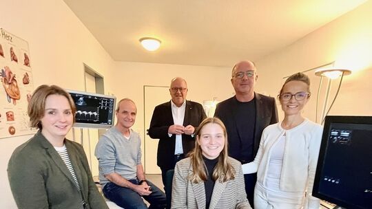 Nathalie Kegel (Mitte) absolviert derzeit einen Teil ihres Praktischen Jahres im Rahmen ihres Medizinstudiums in der Hausarztpraxis Theis in Wissen; mit im Bild (von links): Jennifer Siebert, Veit Braun, Landrat Peter Enders, Michael Theis und Larissa Ferdows-Theis. Foto: Thorsten Stahl/Kreisverwaltung Thorsten Stahl