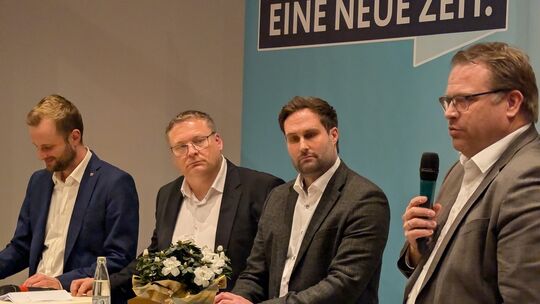 Am Rande spielt auch die "Neunkirchen-Problematik" eine Rolle auf der CDU-Veranstaltung im Herdorfer Knappensaal. Kreisbeigeordnter Tobias Gerhardus (von rechts) äußert sich zum Thema, Betzdorfs Stadtbürgermeister und Landtagskandidat Johannes Behner, sein Ersatzkandidat Dirk Eickhoff und CDU-Kreisvorsitzender Matthias Reuber hören zu. Daniel-D. Pirker