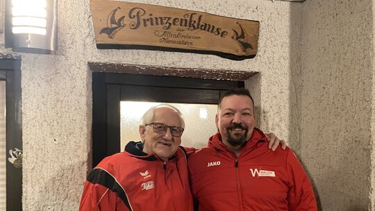 Zwei ehemalige Karnevalsprinzen vor der Prinzenklause. Links Willi Poscharnik mit seinem Schwiegersohn Markus Naumann. Die Holzeinbrennarbeiten des Eingangsschildes wurden von Abraham Thießen angefertigt. Er hat sich auch sehr für den Karnevalsverein engagiert. Werner Klak