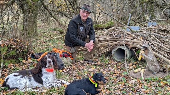 Jagdpächter Matthias Grübl mit seinen beiden Hunden an einer der neun Lebendfallen, die um den Ort Emmerzhausen aufgestellt wurden. Thomas Leurs