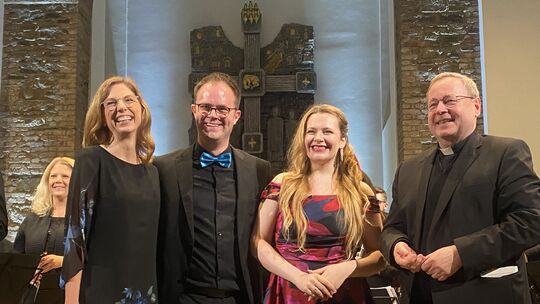 Strahlende Gesichter nach dem Galakonzert der Bläserphilharmonie des Kreises Altenkirchen am Sonntag in der Christuskirche. Von links Moderatorin Sabine Bätzing-Lichtenthäler, Dirigent Marco Lichtenthäler, Sopranistin Florentine Schumacher und Bischof Dr. Georg Bätzing. Werner Klak