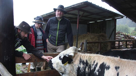 Der Nebenerwerbslandwirt Thomas Brag aus Ingelbach (hier mit seinem Sohn und einem Züchter-Kollegen) hatte weit überregional zum "Pustertaler"-Züchtertreffen eingeladen und erläuterte bei der Rundfahrt über die sieben Weidestücke gerne seine Erfahrungen mit der ruhigen und hierzulande noch eher seltenen Rasse aus Südtirol. Dabei konnten die rund 22 Teilnehmer des Treffens natürlich auch die Bekanntschaft seiner Tiere machen. Julia Hilgeroth-Buchner