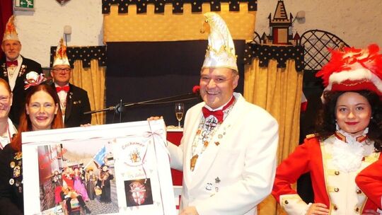 Zum 175-jährigen Bestehen der Cochemer Karnevalsgesellschaft überreicht die Cochemer Möhnenführung mit Sandra Zenz und Obermöhn Nicole Cornely ein Präsent an den CKG-Präsidenten Günter Hammes. Foto: Thomas Esser