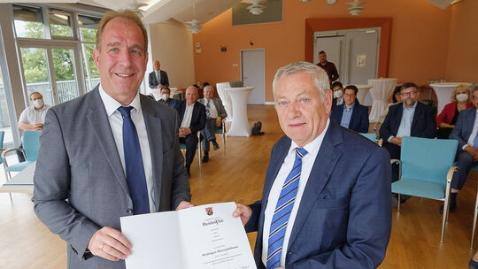 Staatssekretär Randolf Stich übergibt Manfred Schnur eine Urkunde von Ministerpräsidentin Malu Dreyer aus Anlass des 50-jährigen Dienstjubiläums des Cochem-Zeller Landrats. Foto: Kevin Rühle Kevin Ruehle
