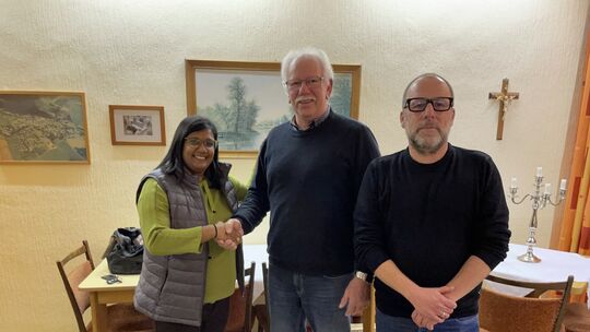 Aus den Händen der neuen SV-Chefin Annette Piroth erhält der langjährige Vorsitzende des Lieger Sportvereines, Werner Lauxen, Bildmitte, als Dankeschön ein Präsent für sein jahrelanges Engagement. Mit ihm freut sich Kassierer Michael Kuhn, rechts. Heinz Kugel
