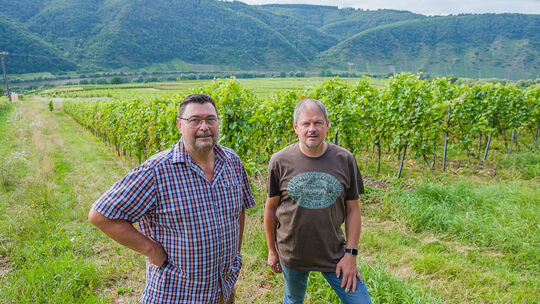 Mesenichs Ortsbürgermeister Peter Serwazi und Beigeordneter Martin Arens zeigen die Weinbergsbrache in der Gemarkung „Auf Wachholder“. Hier könnte auf vier Hektar Bauland gebaut werden, das Gelände gehört der Gemeinde. Foto: Kevin Rühle