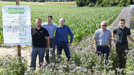 Mehr Blühstreifen ans Feld: Das wollen Tobias Fuchs (2. von links), Kreisbauernchef, und Mitstreiter von DLR und VLF verwirklichen. In den Kreisen MYK und Cochem-Zell bewirtschaften Landwirte insgesamt 1,2 Millionen Quadratmeter Fläche. Foto: Andreas Walz Andreas Walz