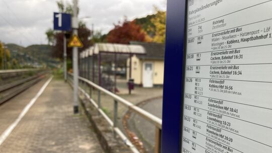 Ersatzfahrplan am Bahnhof in Treis-Karden: Die Deutsche Bahn (DB) kündigt für die kommende Woche einen Schienenersatzverkehr auf der Strecke zwischen Cochem und Koblenz an. Dort fahren dann Busse. Grund dafür sind diverse Baumaßnahmen auf der Strecke, die mit einer Vollsperrung einhergehen. David Ditzer