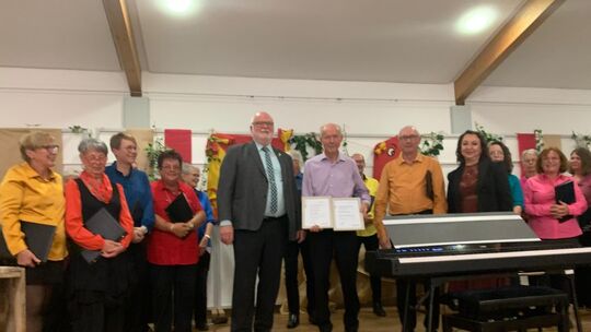 Inmitten seines Chores wird Herbert Brück (Bildmitte) vom Vorsitzenden des Kreis-Chorverbandes Cochem, Ulrich Duennes, (links), mit zwei Urkunden und einer Ehrennadel für seinen langjährigen Einsatz im Laubacher Chor und im Vorstand geehrt. Heinz Kugel