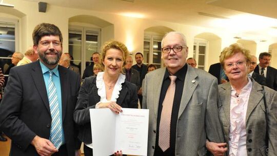 Adolf Laux (3. von links) ist von Staatssekretärin Heike Raab (2. von links) für seine Lebensleistung mit der Ehrennadel des Landes ausgezeichnet worden. Darüber freuen sich auch Stadtbürgermeister Wolfgang Lambertz und Laux' Gattin. Foto: Andreas Walz