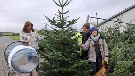 Ulla Grundhöfer (links) ist froh, dass sie ihren Baum schneller als gedacht gefunden hat. Dank der Hilfe von Peter und Maka Lentz, die seit 20 Jahren auf ihrer Plantage zwischen Hetzerath und Sehlem Weihnachtsbäume großziehen. Seit fünf Jahren immer mit dabei: Hund Bobby. TV/Sybille Schönhofen